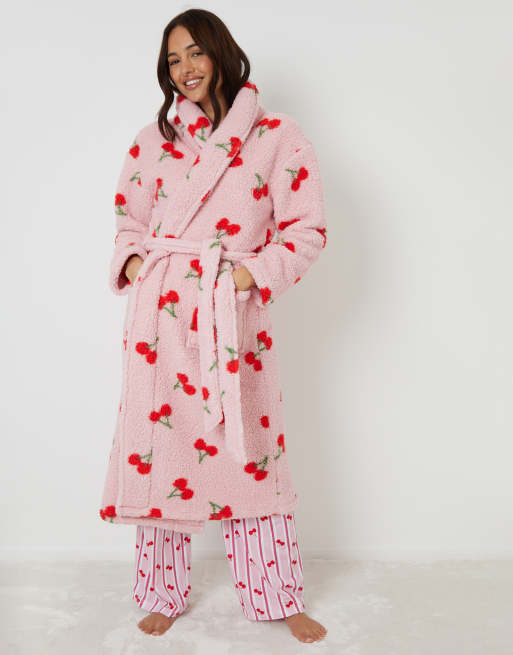 Threadbare Cherry print borg dressing gown in pink