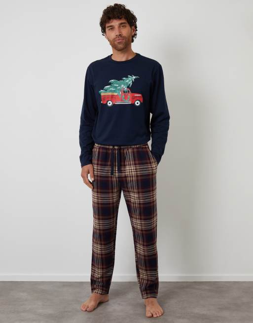 Threadbare Christmas truck graphic long check pyjama set in navy