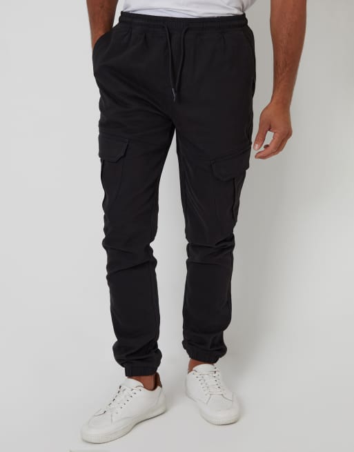 Threadbare Cotton blend cuffed cargo pocket trousers in black