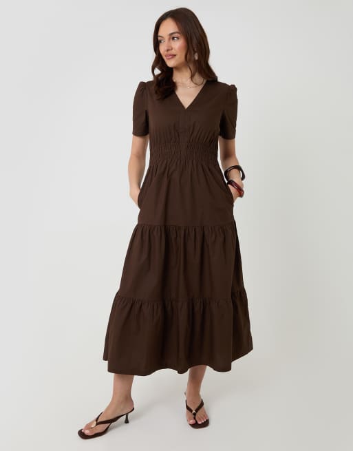 Threadbare Cotton poplin tiered midaxi dress in chocolate