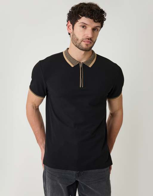 Threadbare Cotton tipping collar quarter zip pique polo shirt in black