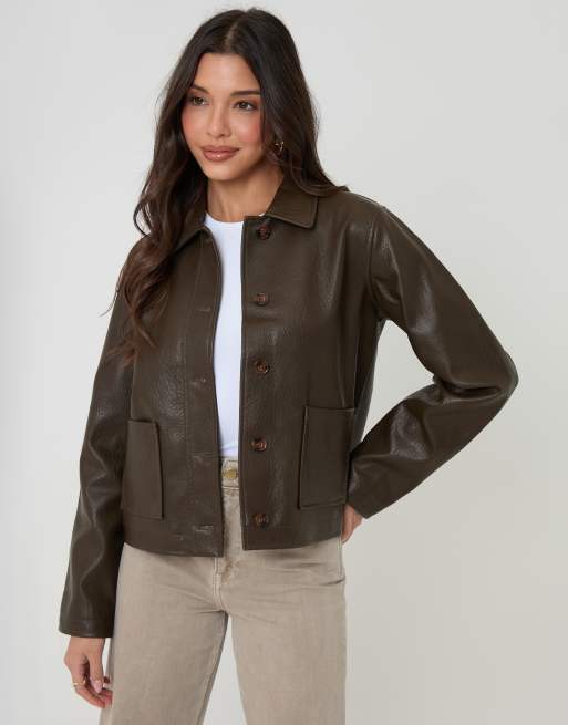 Threadbare Faux leather cropped button up jacket in chocolate