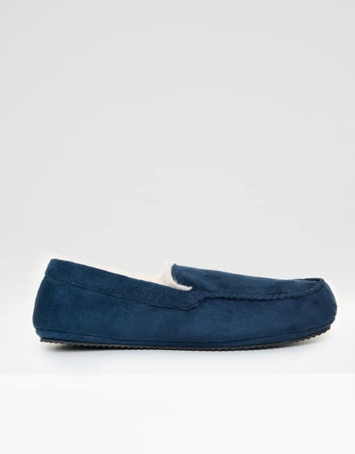Threadbare Faux suede faux fur lined moccasin slippers in navy