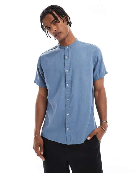 Threadbare Grandad collar linen blend short sleeve shirt in blue