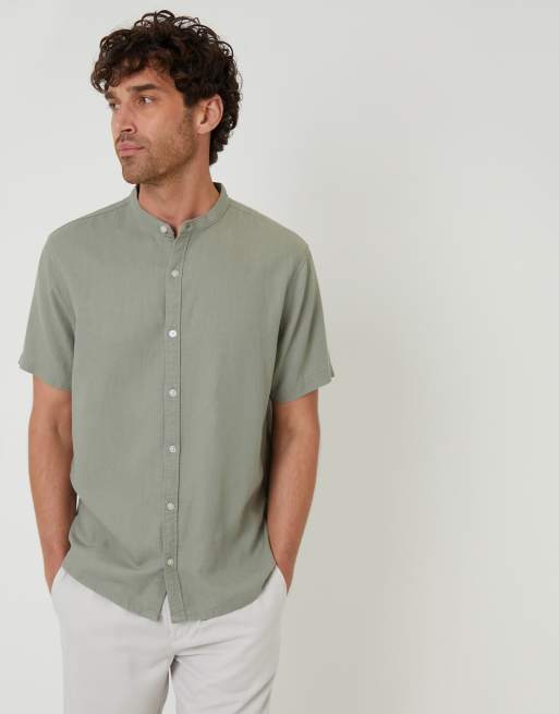 Threadbare Grandad collar linen blend short sleeve shirt in pale green