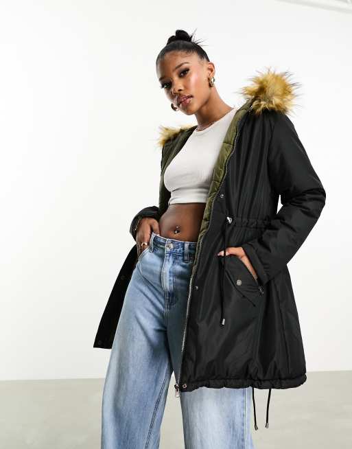 Threadbare Kenny 2 in 1 parka jacket with faux fur trim hood in black and khaki