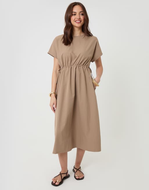Threadbare Kimono sleeve drawstring waist midi dress in taupe