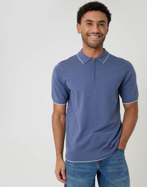 Threadbare Knitted quarter zip polo with contrast tipping in blue