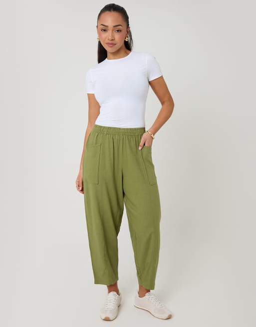 Threadbare Linen blend pocket detail barrel leg trousers in olive