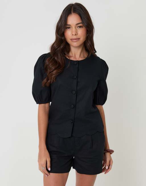 Threadbare Linen blend puff sleeve top in black