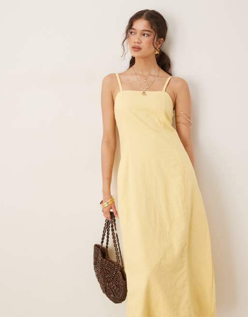 Threadbare Linen blend square neck midi dress in yellow