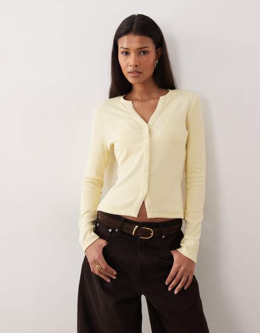 Threadbare long sleeve button through ribbed top in lemon yellow