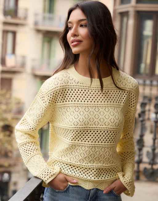 Threadbare Long sleeve pointelle crochet knit jumper in lemon