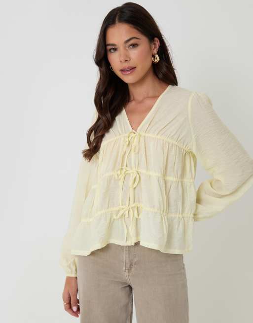 Threadbare Long sleeve tie front blouse in yellow