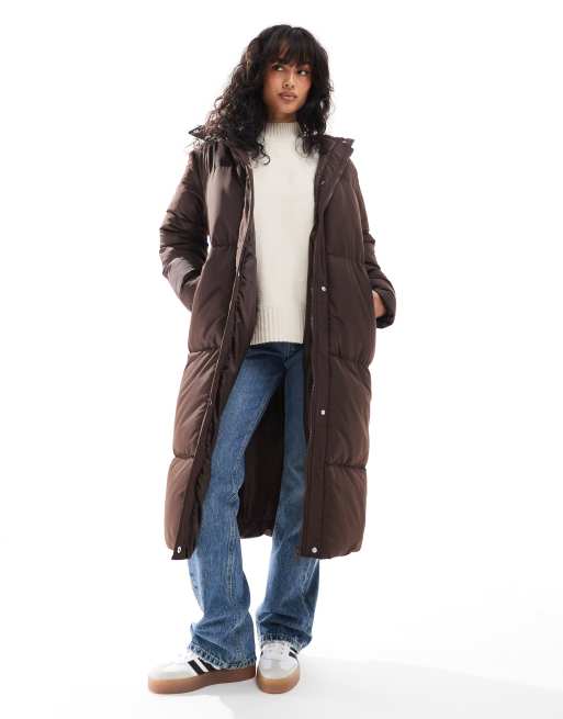 Threadbare maxi puffer coat with hood in brown