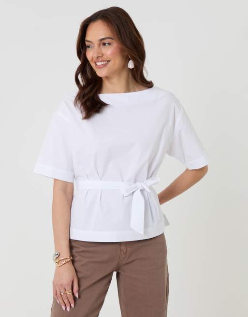 Threadbare Poplin slash neck tie belt top in white