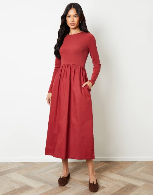 Threadbare Rib jersey 2-in-1 midi dress with poplin skirt in terracotta