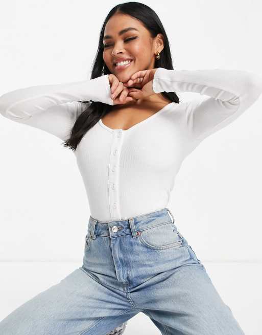 Threadbare ribbed button front long sleeve bodysuit in white