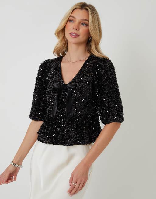 Threadbare Sequin velour bow detail blouse in black