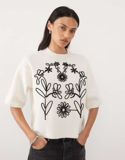 Threadbare short sleeve jumper with flower embroidery in ecru