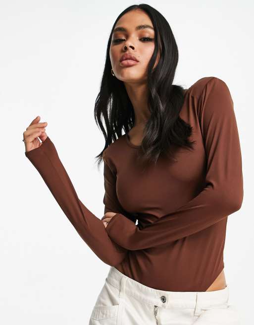 Threadbare super stretch long sleeve bodysuit with shoulder pads in chocolate brown