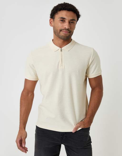 Threadbare Textured cotton quarter zip polo shirt in natural