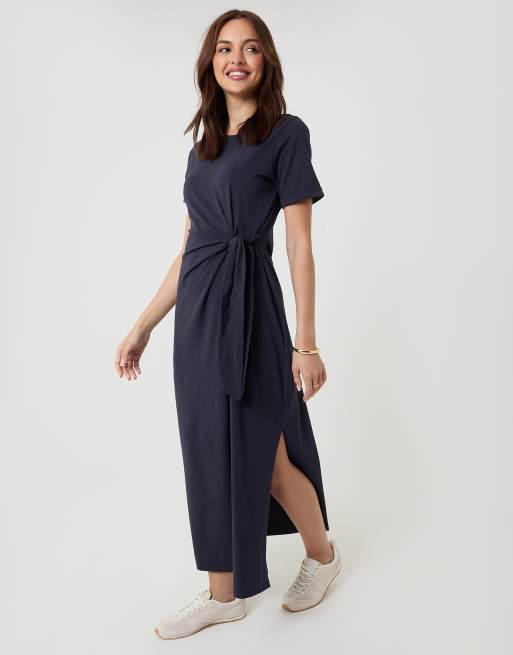 Threadbare Tie front side split cotton jersey midi dress in navy