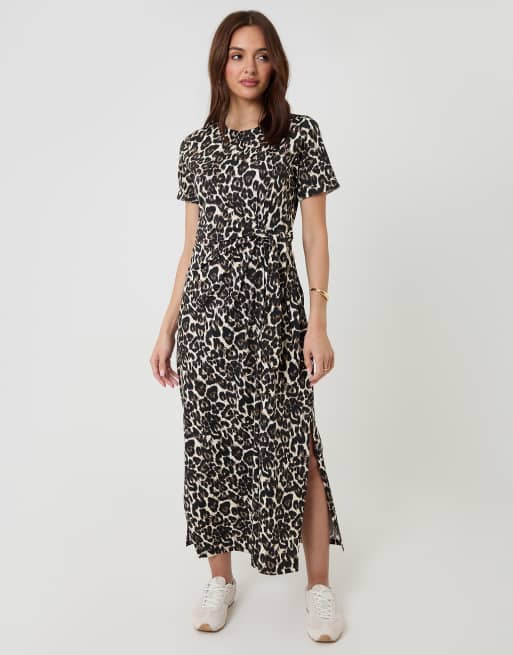 Threadbare Tie front side split cotton jersey midi dress in tan