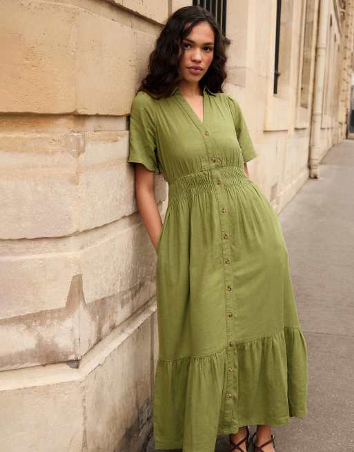 Threadbare Tiered linen blend v neck maxi dress in olive