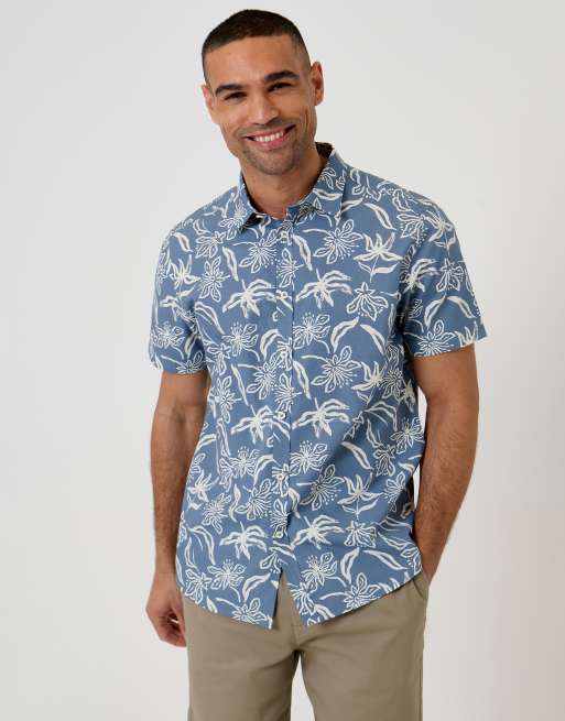 Threadbare Tropical print cotton short sleeve shirt in blue