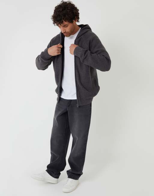 Threadbare Zip-up knitted hoodie with microfleece lining in charcoal