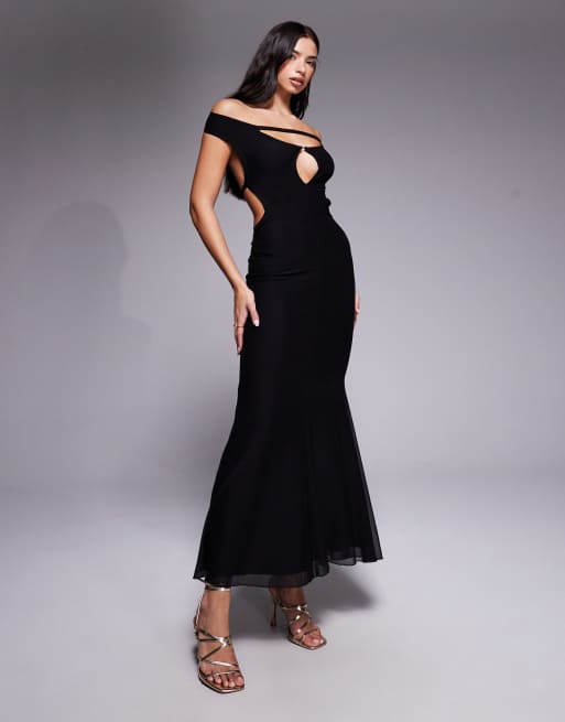 Tiger Mist Kerrigan bardot keyhole open back strap detail fishtail maxi dress in black
