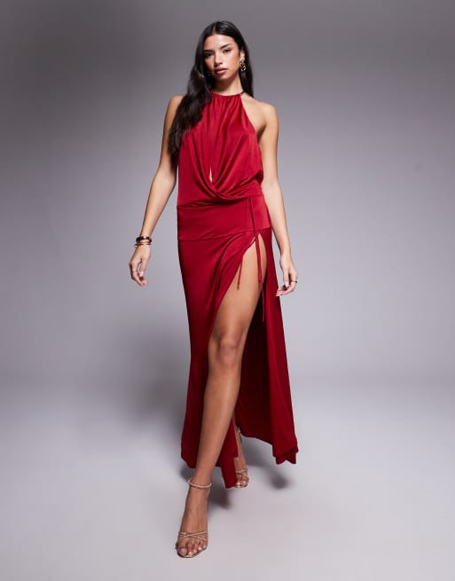 Tiger Mist Tarrin metal halterneck ring detail extreme plunge neck tie side maxi dress in red