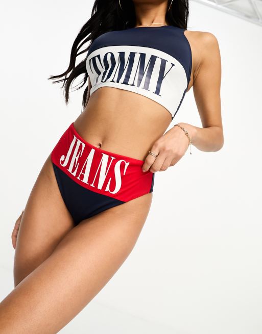 Tommy Jeans archive high waist cheeky bikini bottom in navy and red