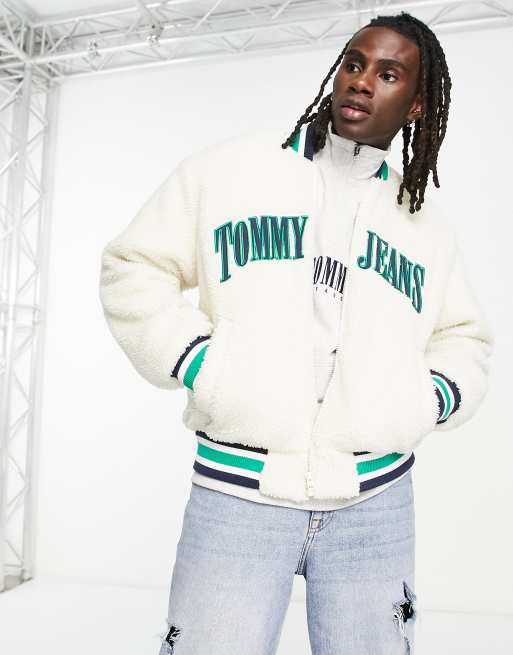 Tommy Jeans collegiate logo sherpa varsity jacket in off white