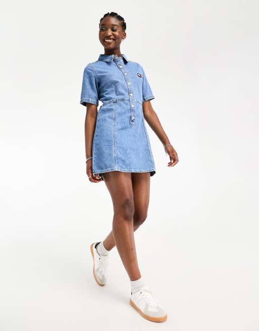 Tommy Jeans fitted button up denim mini dress in medium wash