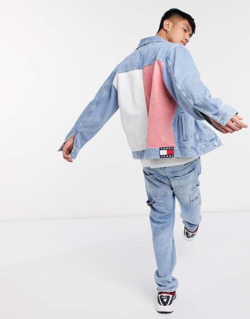 Tommy Jeans flag print oversized denim trucker jacket in mid wash