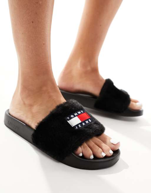 Tommy Jeans fur pool sliders in black