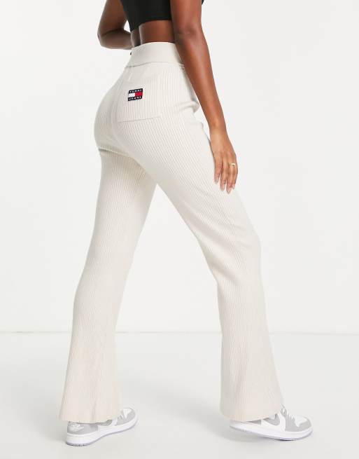 Tommy Jeans logo badge ribbed wide leg trouser in stone
