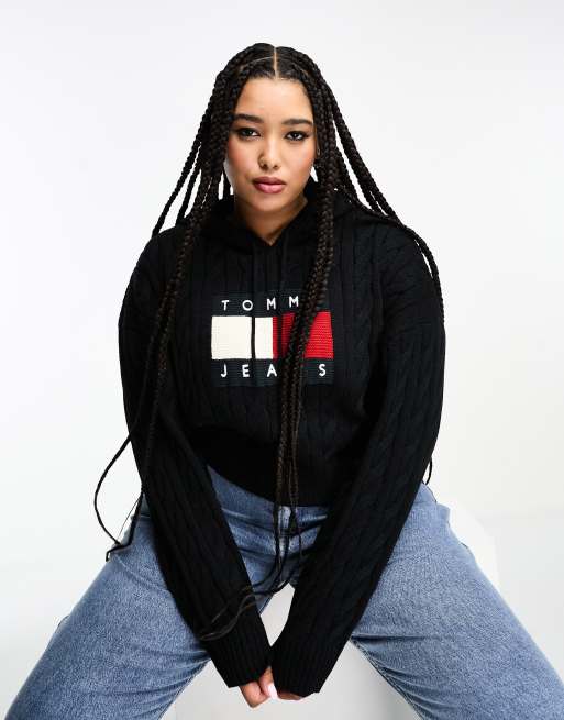 Tommy Jeans Plus centre flag logo cable knit hoodie in black