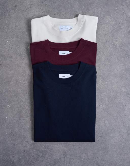 Topman 3 pack relaxed t-shirt in ecru, navy and burgundy