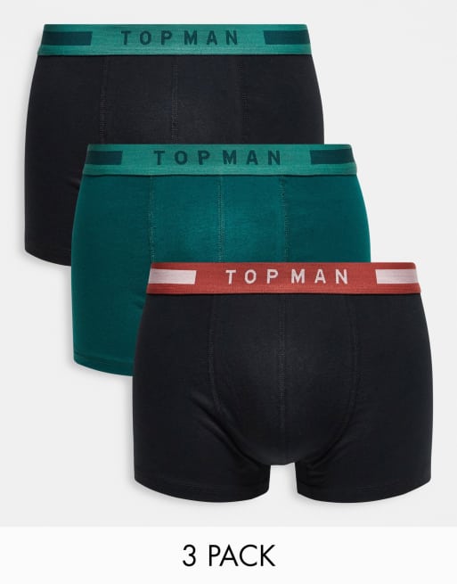 Topman 3 pack trunks in black and green with coloured waistbands