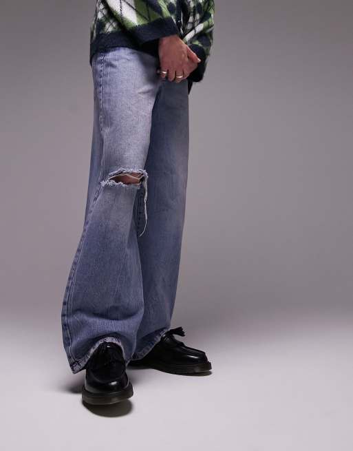 Topman baggy ripped jeans in mid wash blue