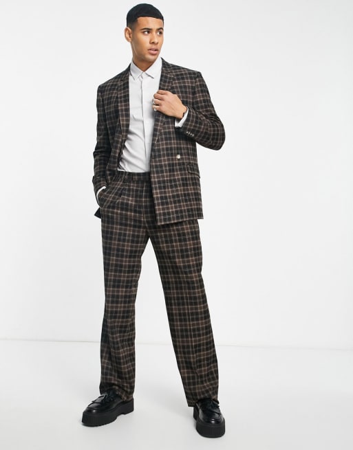 Topman checked boxy jacket and wide leg trouser suit in brown