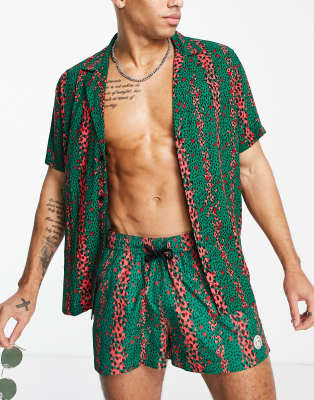 Topman deep revere shirt with animal print stripe in green