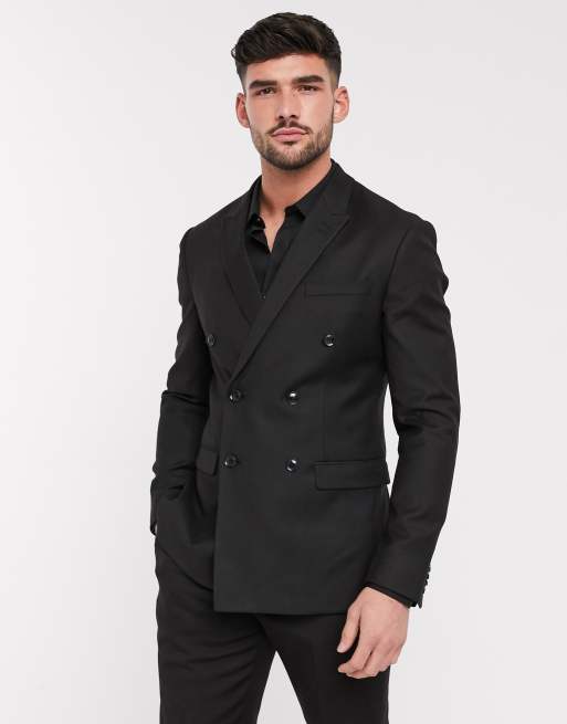 Topman double breasted slim suit jacket in black