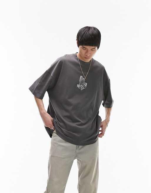 Topman extreme oversized fit t-shirt with praying hands embroidery in charcoal