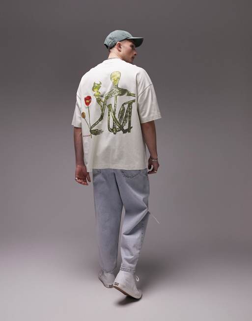 Topman extreme oversized t-shirt with front and back Nirvana rose print in washed ecru