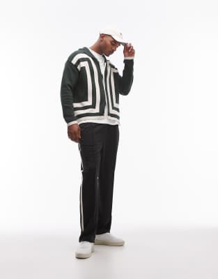 Topman knitted crochet vertical stripe button through long sleeve shirt in dark green
