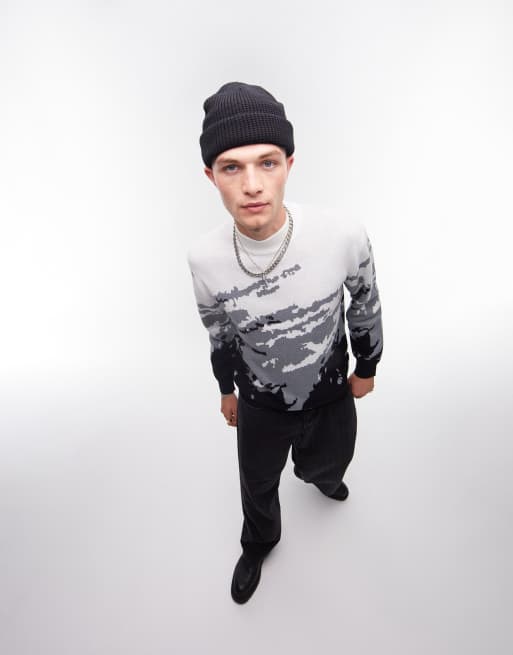 Topman knitted turtle neck jumper with all over print in mono